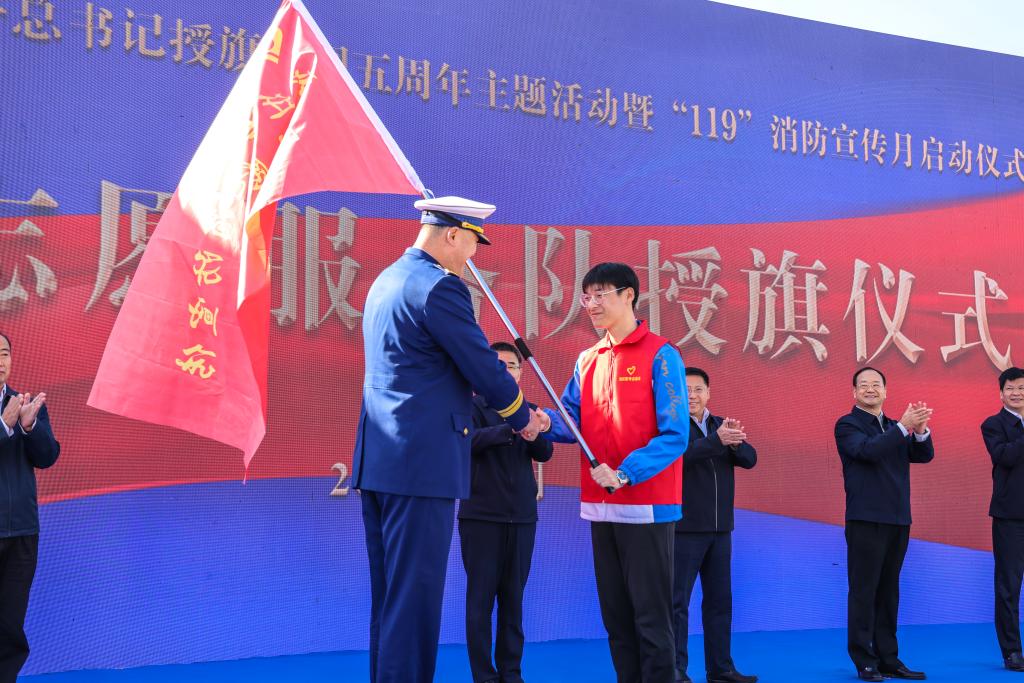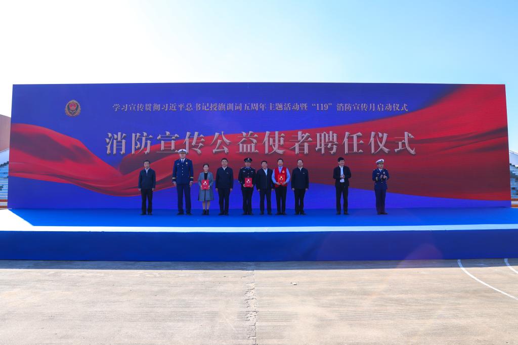 启动仪式上,王逍霄副市长、徐德书记、潘志明校长共同为宿迁市消防宣传大使颁发了聘书;宿迁市消防救援支队支队长马磊为我校消防志愿服务队授旗。