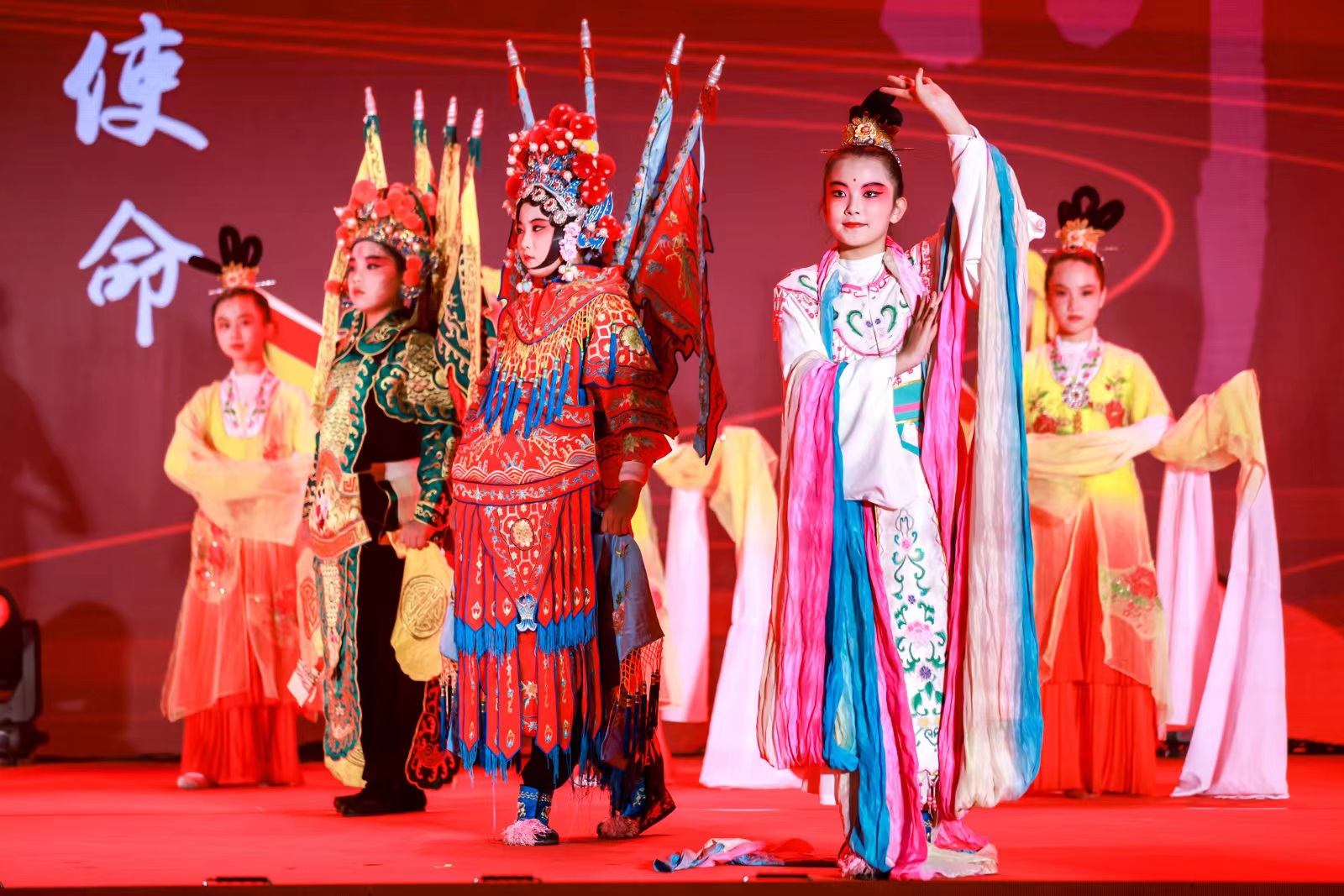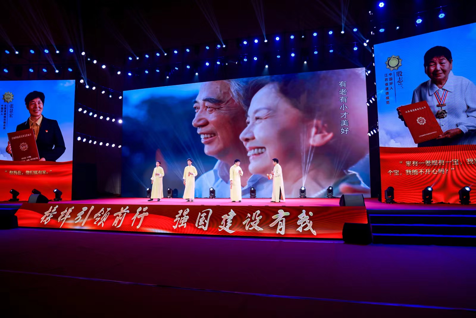 致敬道德模范,学习身边好人。晚上6时30分,巡演在戏曲联唱《榜样的力量》中拉开序幕,高亢清亮的戏曲响彻礼堂,京、昆、锡、淮、扬,每一个剧种都大放异彩,专业演员和宿迁孝慈少儿京剧团的孩子一起将榜样的力量融入心底。情景讲述《点亮爱心》、音乐快板《孝老爱亲一脉传》、故事讲述《带着奶奶上大学》、情景诗画《坚守》、清曲说唱《土地情深》、故事讲述《巷子里的磨刀声》、情景短剧《守护者》、朗诵《追寻》等节目轮番上演,一个个闪亮的名字,一个个动人的故事,感人至深,充满力量,传递到每个学子的心田。