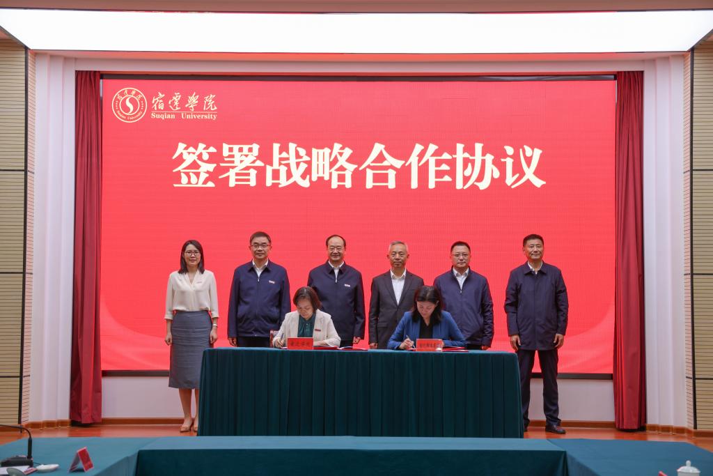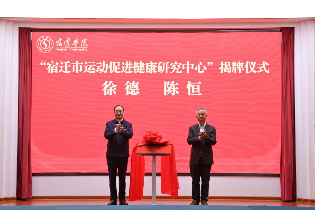 副校长丁红燕、市体育局副局长王艳代表双方签署战略合作协议。校党委书记徐德、市体育局局长陈恒共同为宿迁市运动促进健康研究中心揭牌。