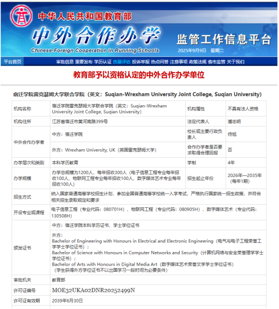 宿迁学院雷克瑟姆大学联合学院致力于培养具有国际化视野、跨文化交际能力、创新思维能力的专业人才。该机构办学层次为本科学历教育,采取“4+0”国际化培养模式,首批将开设电子信息工程、物联网工程及数字媒体艺术3个本科专业,各专业每年招生100人,办学总规模为1200人,纳入国家普通高等学校招生计划。学生修业合格后,颁发宿迁学院本科学历证书、学士学位证书,以及英国雷克瑟姆大学学士学位证书。