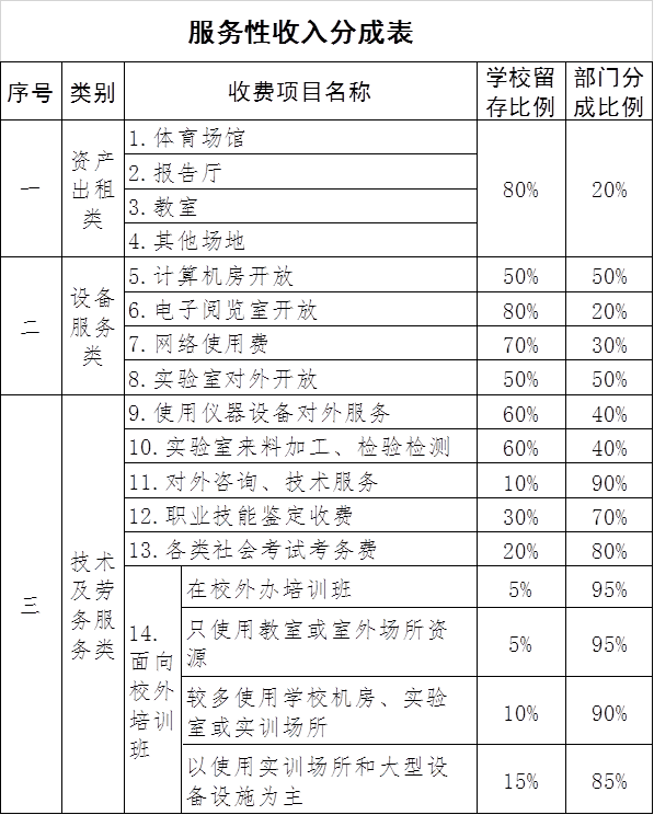 第十二条 服务性收入分不同类型按规定比例在学校和部门单位之间分配(详见收入分成表)。各部门(单位)分成的收入金额为税后金额,收入分成表未列示的收入项目,由收入部门(单位)申请,经校长办公会批复后按批复比例分成。