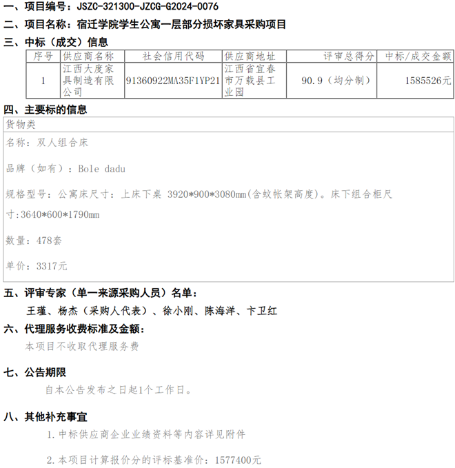 宿迁学院学生公寓一层部分损坏家具采购项目中标公告