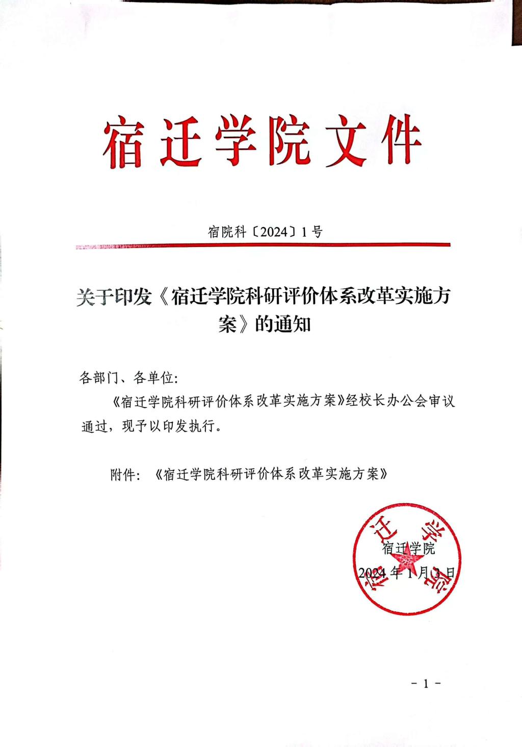 宿迁学院科研评价体系改革实施方案 (宿院科〔2024〕1号 )